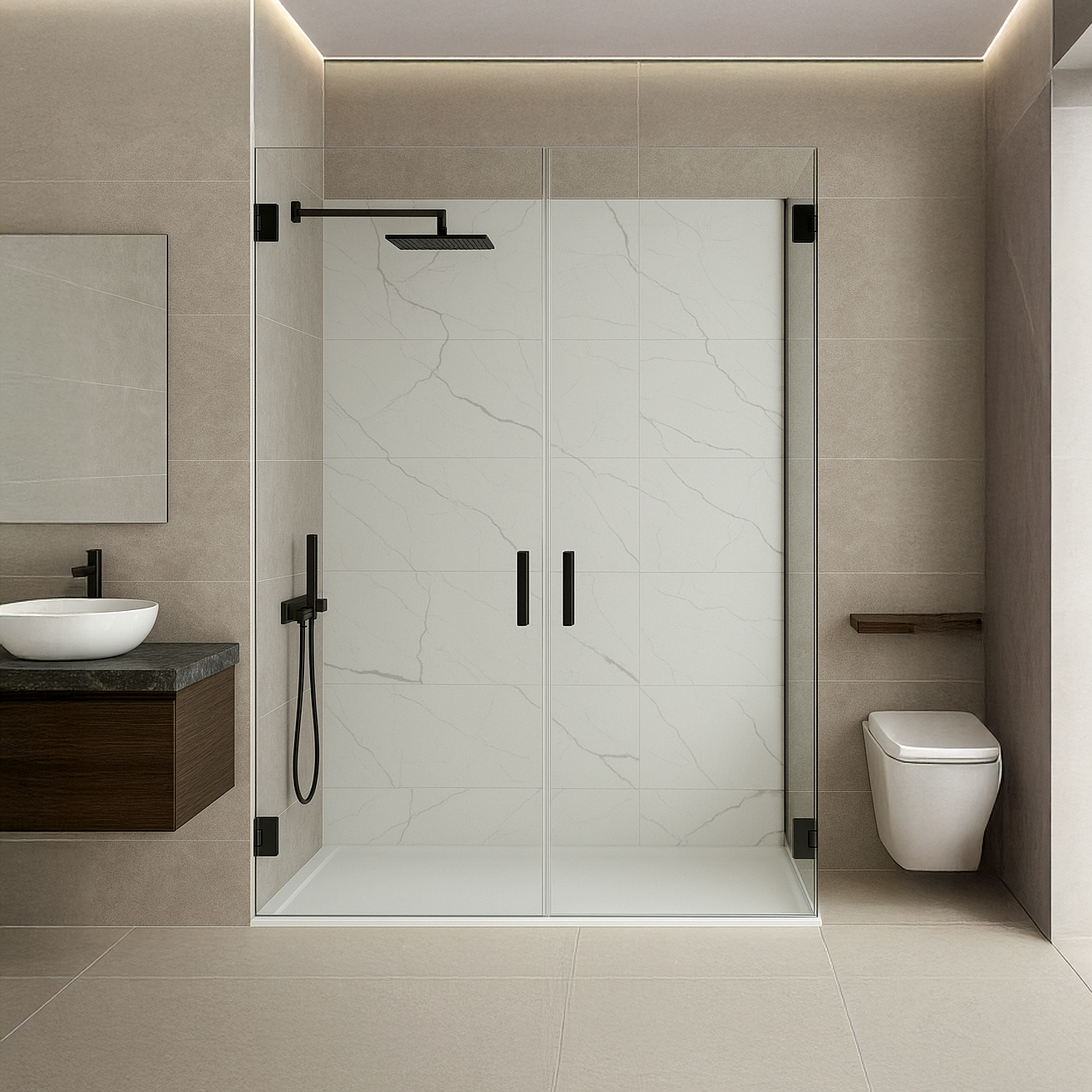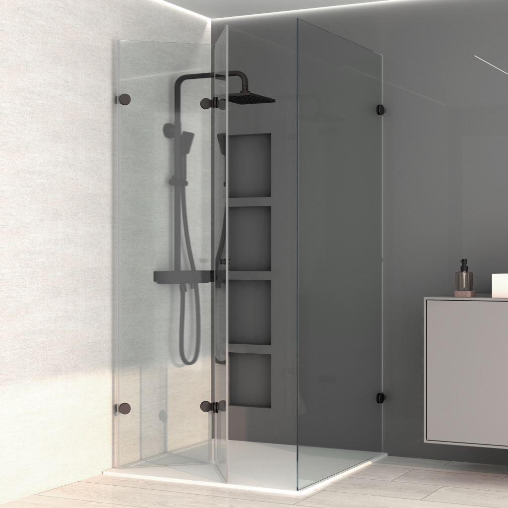 Deux ensembles fixe + porte coulissante à 90°.
