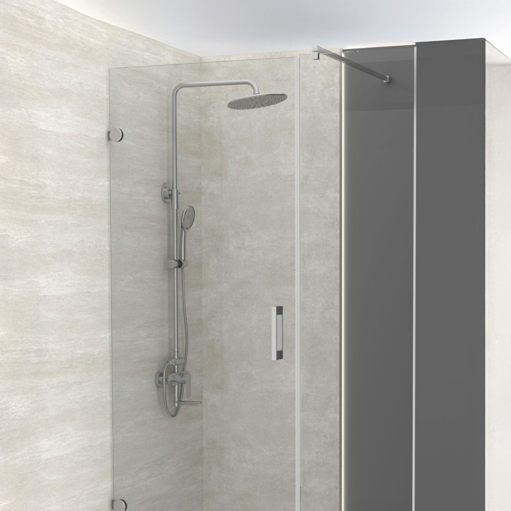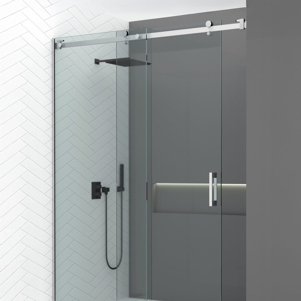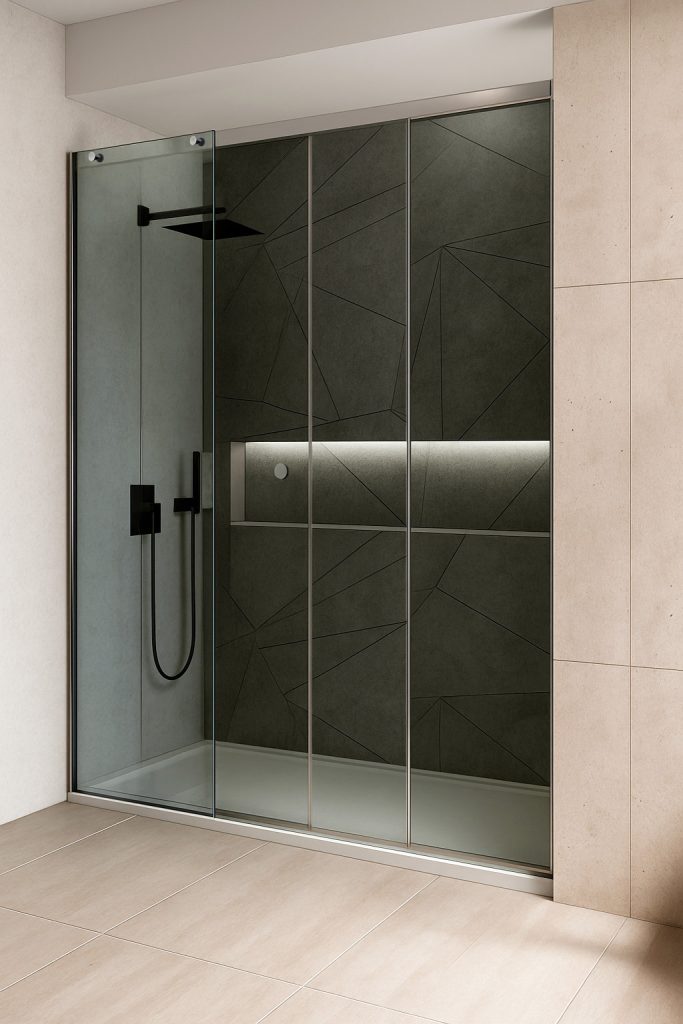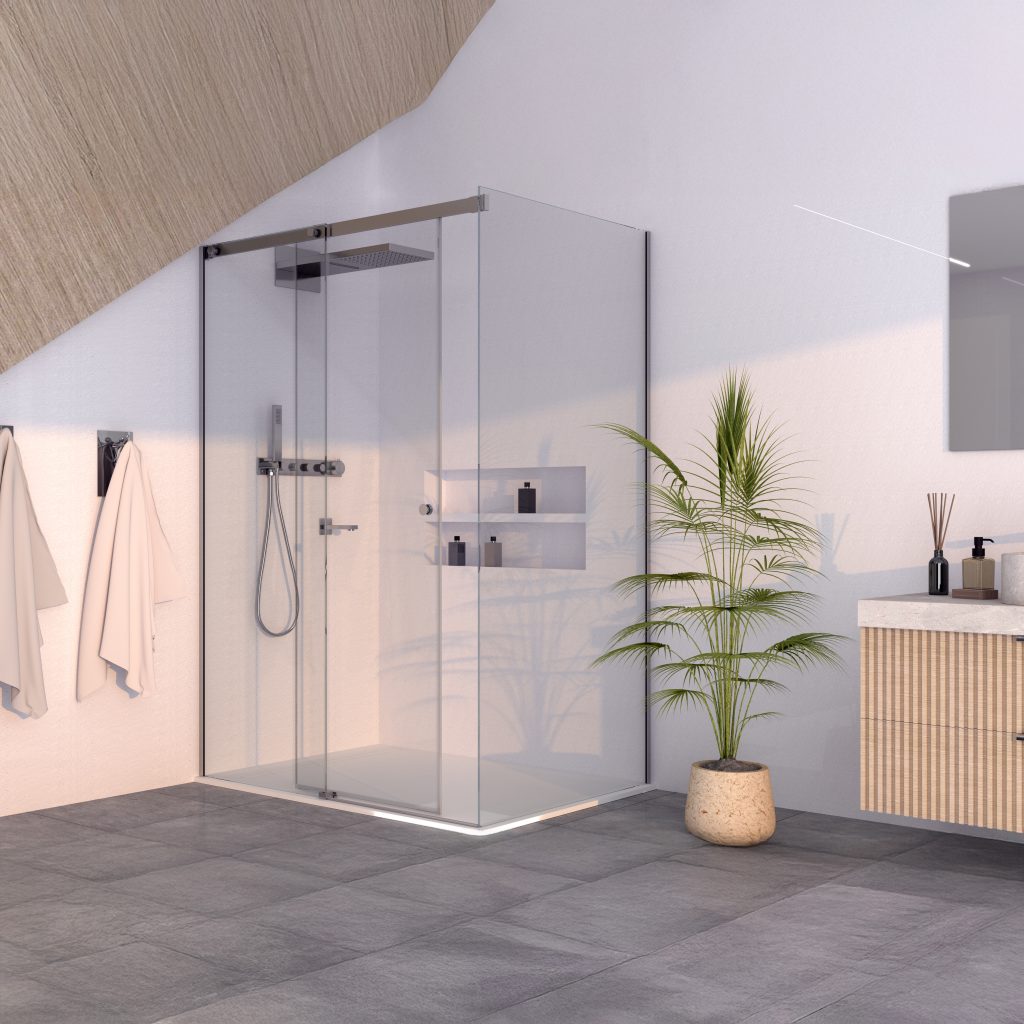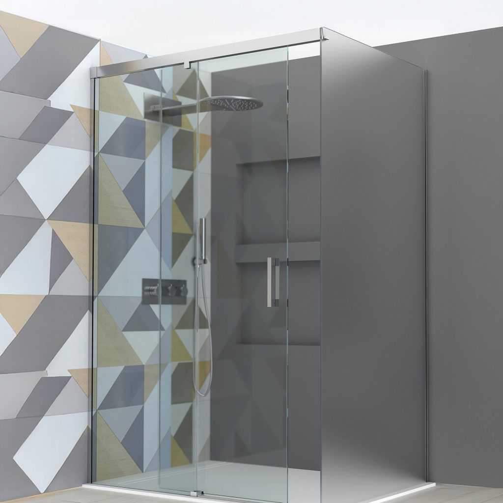 Panneau fixe avec porte coulissante et un autre fixe à 90°.