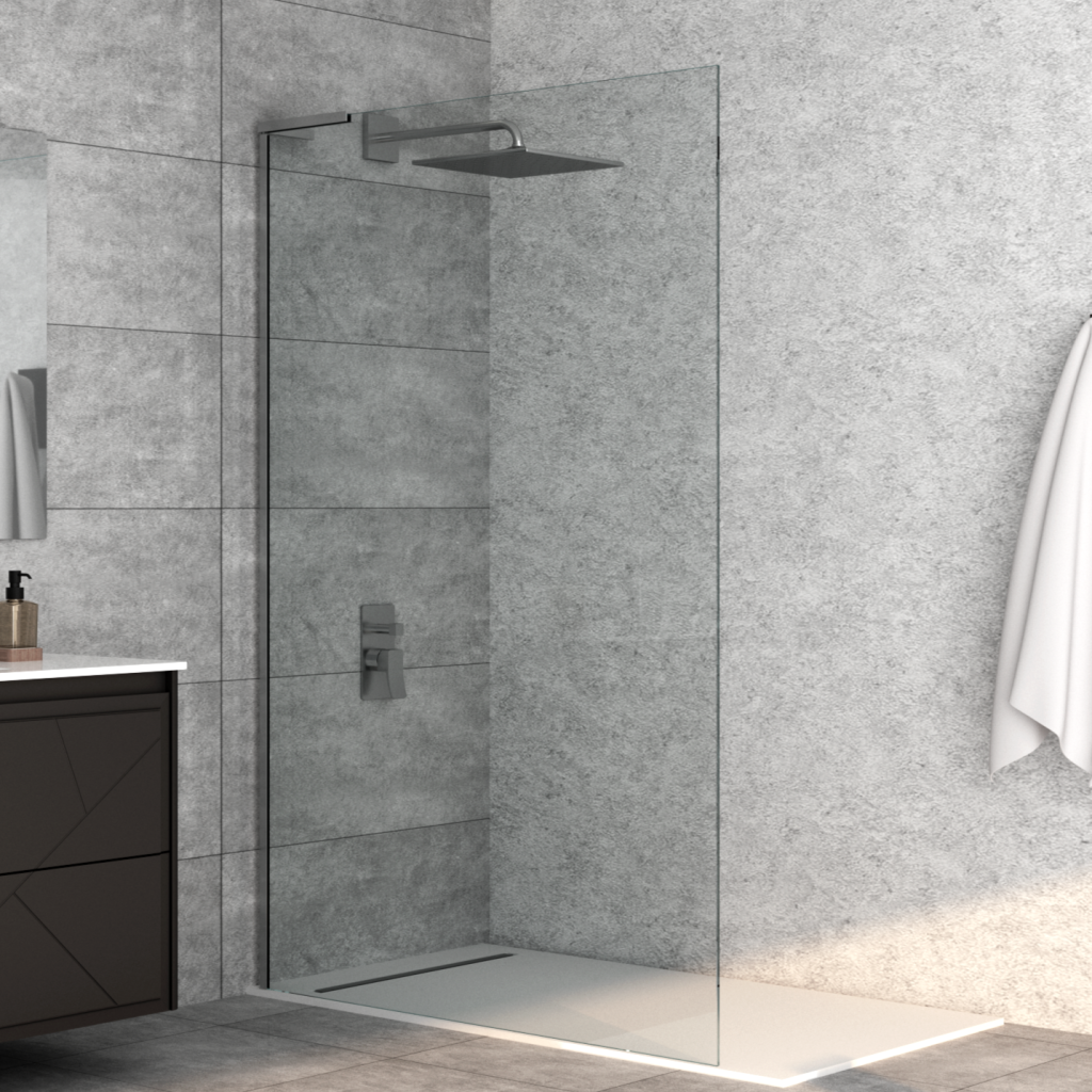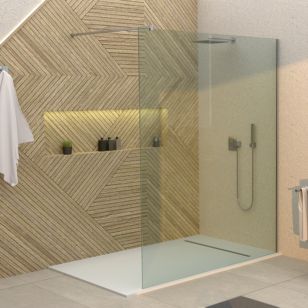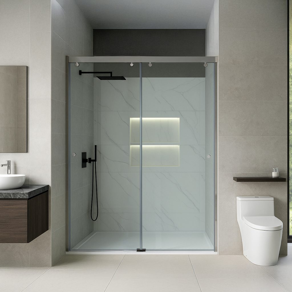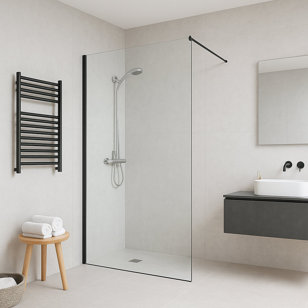 Panneau fixe avec porte coulissante et un autre fixe à 90°.